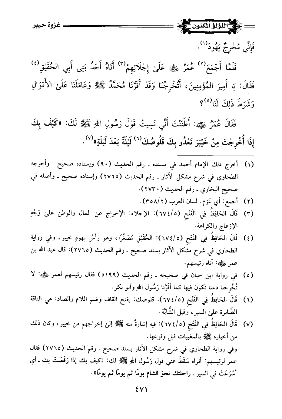 (¬5) في رواية ابن حبان في صحيحه - رقم الحديث (5199) فقال رئيسهم لعمر -رضي اللَّه عنه-: لا تُخْرِجنا دعنا نكون فيها كما أقَرَّنا رَسُول اللَّهِ وأبو بكر.