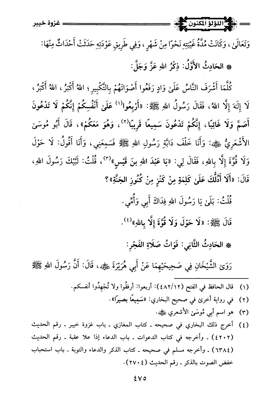 (¬4) أخرج ذلك البخاري في صحيحه - كتاب المغازي - باب غزوة خيبر - رقم الحديث (4202) - وأخرجه في كتاب الدعوات - باب الدعاء إذا علا عقبة - رقم الحديث (6384) - وأخرجه مسلم في صحيحه - كتاب الذكر والدعاء والتوبة - باب استحباب خفض الصوت بالذكر- رقم الحديث (2704).