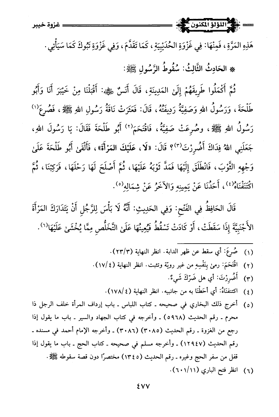 (¬5) أخرج ذلك البخاري في صحيحه - كتاب اللباس - باب إرداف المرأة خلف الرجل ذا محرم - رقم الحديث (5968) - وأخرجه في كتاب الجهاد والسير - باب ما يقول إذا رجع من الغزوة - رقم الحديث (3085) (3086) - وأخرجه الإِمام أحمد في مسنده - رقم الحديث (12947) - وأخرجه مسلم في صحيحه - كتاب الحج - باب ما يقول إذا قفل من سفر الحج وغيره - رقم الحديث (1345) مختصرًا دون قصة سقوطه -صلى اللَّه عليه وسلم-.