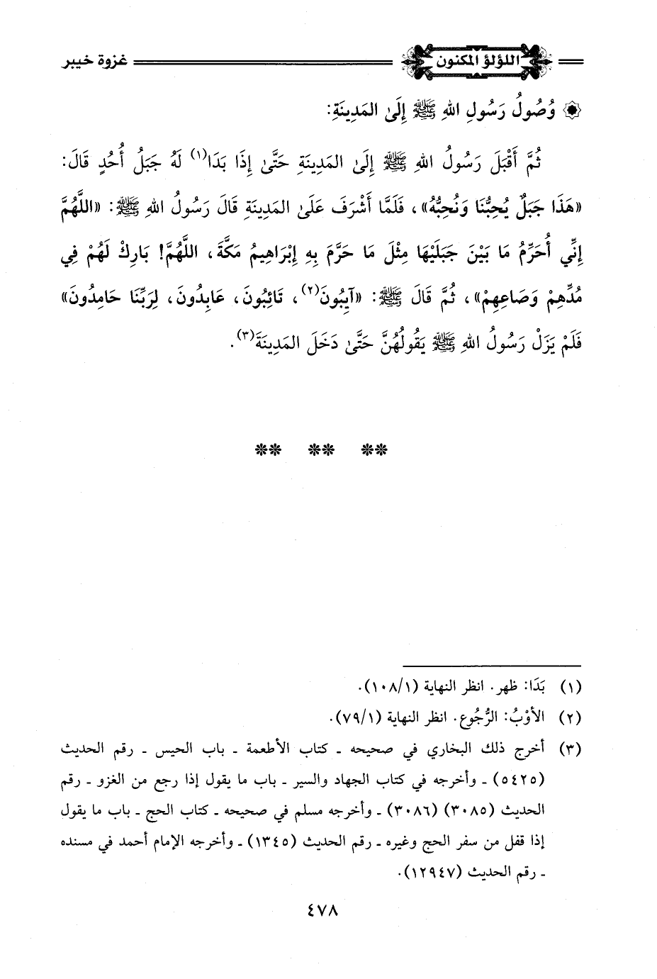 (¬3) أخرج ذلك البخاري في صحيحه - كتاب الأطعمة - باب الحيس - رقم الحديث (5425) - وأخرجه في كتاب الجهاد والسير - باب ما يقول إذا رجع من الغزو - رقم الحديث (3085) (3086) - وأخرجه مسلم في صحيحه - كتاب الحج - باب ما يقول إذا قفل من سفر الحج وغيره - رقم الحديث (1345) - وأخرجه الإِمام أحمد في مسنده - رقم الحديث (12947).