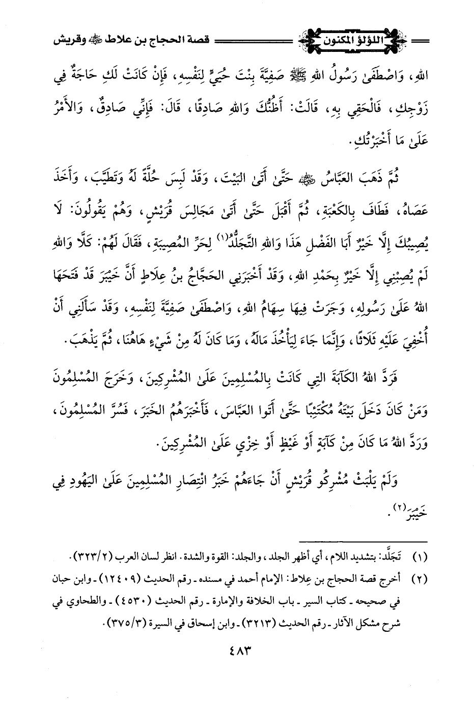 (¬2) أخرج قصة الحجاج بن عِلاط: الإِمام أحمد في مسنده - رقم الحديث (12409) - وابن حبان في صحيحه - كتاب السير - باب الخلافة والإمارة - رقم الحديث (4530) - والطحاوي في شرح مشكل الآثار - رقم الحديث (3213) - وابن إسحاق في السيرة (3/ 375).