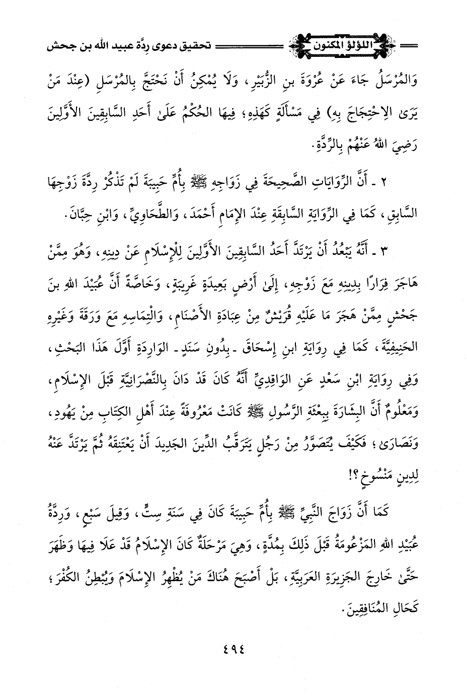 2 - أَنَّ الرِّوَايَاتِ الصَّحِيحَةَ في زَوَاجِهِ -صلى اللَّه عليه وسلم- بِأُمِّ حَبِيبَةَ لَمْ تَذْكُرْ رِدَّةَ زَوْجِهَا السَّابِقِ، كَمَا في الرِّوَايَةِ السَّابِقَةِ عِنْدَ الإِمَامِ أَحْمَدَ، وَالطَّحَاوِيِّ، وَابْنِ حِبَّانَ.