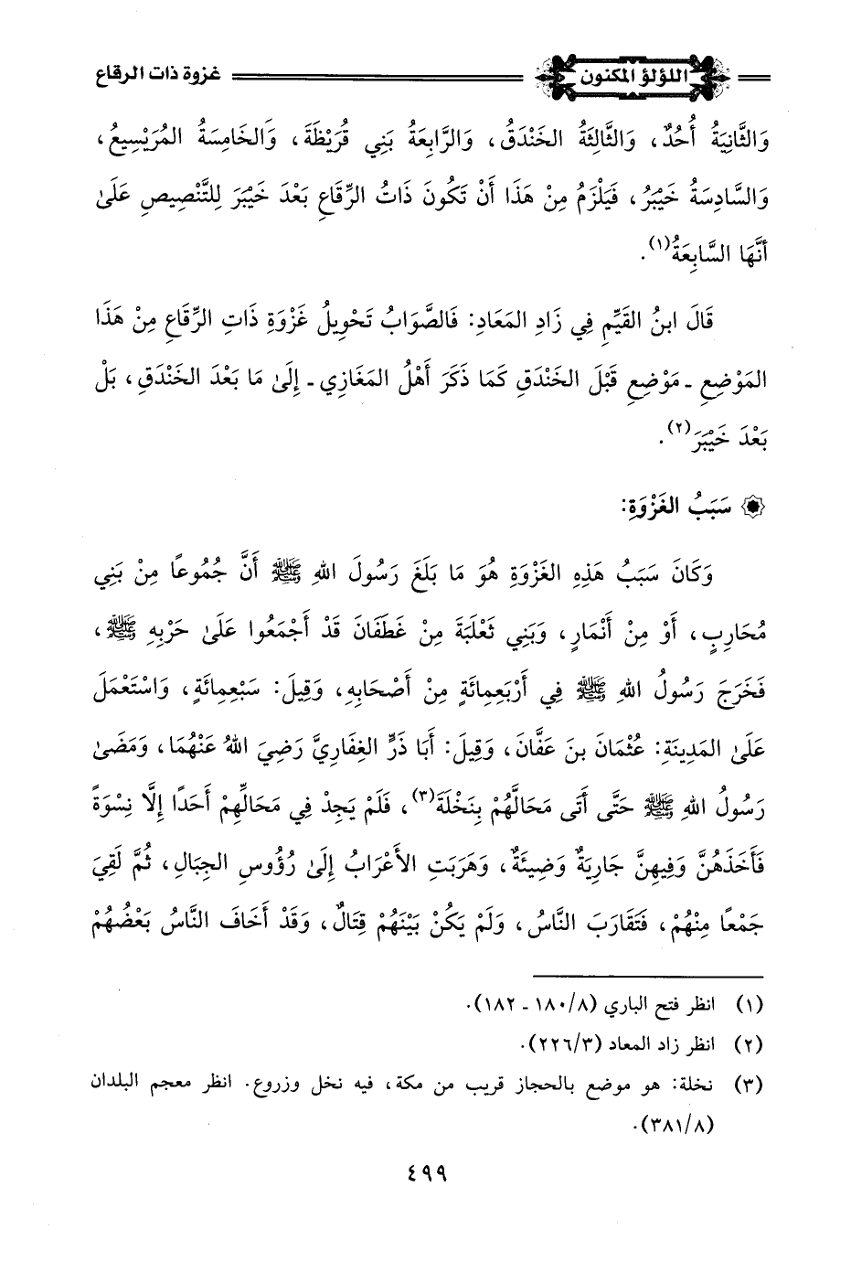 وَكَانَ سَبَبُ هَذِهِ الغَزْوَةِ هُوَ مَا بَلَغَ رَسُولَ اللَّهِ -صلى اللَّه عليه وسلم- أَنَّ جُمُوعًا مِنْ بَنِي مُحَارِبٍ، أَوْ مِنْ أَنْمَارٍ، وَبَنِي ثَعْلَبَةَ مِنْ غَطفَانَ قَدْ أَجْمَعُوا عَلَى حَرْبِهِ -صلى اللَّه عليه وسلم-، فَخَرَجَ رَسُولُ اللَّهِ -صلى اللَّه عليه وسلم- في أَرْبَعِمِائَةٍ مِنْ أَصْحَابِهِ، وَقِيلَ: سَبْعِمِائَةٍ، وَاسْتَعْمَلَ عَلَى المَدِينَةِ: عُثْمَانَ بنَ عَفَّانَ، وَقِيلَ: أَبَا ذَرٍّ الغِفَارِيَّ رَضِيَ اللَّهُ عَنْهُمَا، وَمَضَى رَسُولُ اللَّهِ -صلى اللَّه عليه وسلم- حَتَّى أَتَى مَحَالَّهُمْ بِنَخْلَةَ (¬3)، فَلَمْ يَجِدْ في مَحَالِّهِمْ أَحَدًا إِلَّا نِسْوَةً فَأَخَذَهُنَّ وَفِيهِنَّ جَارِيَةٌ وَضِيئَةٌ، وَهَرَبَتِ الأَعْرَابُ إلى رُؤُوسِ الجِبَالِ، ثُمَّ لَقِيَ جَمْعًا مِنْهُمْ، فتَقَارَبَ النَّاسُ، وَلَمْ يَكُنْ بَيْنَهُمْ قِتَالٌ، وَقَدْ أَخَافَ النَّاسُ بَعْضُهُمْ
