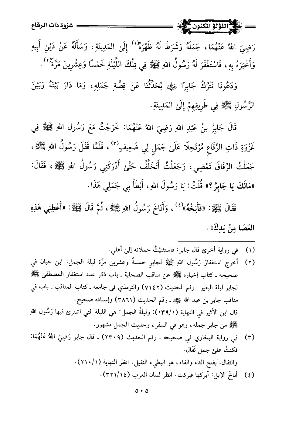 قَالَ جَابِرُ بنُ عَبْدِ اللَّهِ رَضِيَ اللَّهُ عَنْهُمَا: خَرَجْتُ مَعَ رَسُول اللَّهِ -صلى اللَّه عليه وسلم- فِي غَزْوَةِ ذَاتِ الرِّقَاعِ مُرْتَحِلًا عَلَى جَمَلٍ لِي ضَعِيفٍ (¬3)، فَلَمَّا قَفَلَ رَسُولُ اللَّهِ -صلى اللَّه عليه وسلم-، جَعَلْتُ الرِّفَاق تَمْضِي، وَجَعَلْتُ أَتَخَلَّفُ حَتَّى أَدْرَكَنِي رَسُولُ اللَّهِ -صلى اللَّه عليه وسلم-، فَقَالَ: "مَالَكَ يَا جَابِرُ؟ " قُلْتُ: يَا رَسُولَ اللَّهِ، أَبْطَأَ بِي جَمَلِي هَذَا.