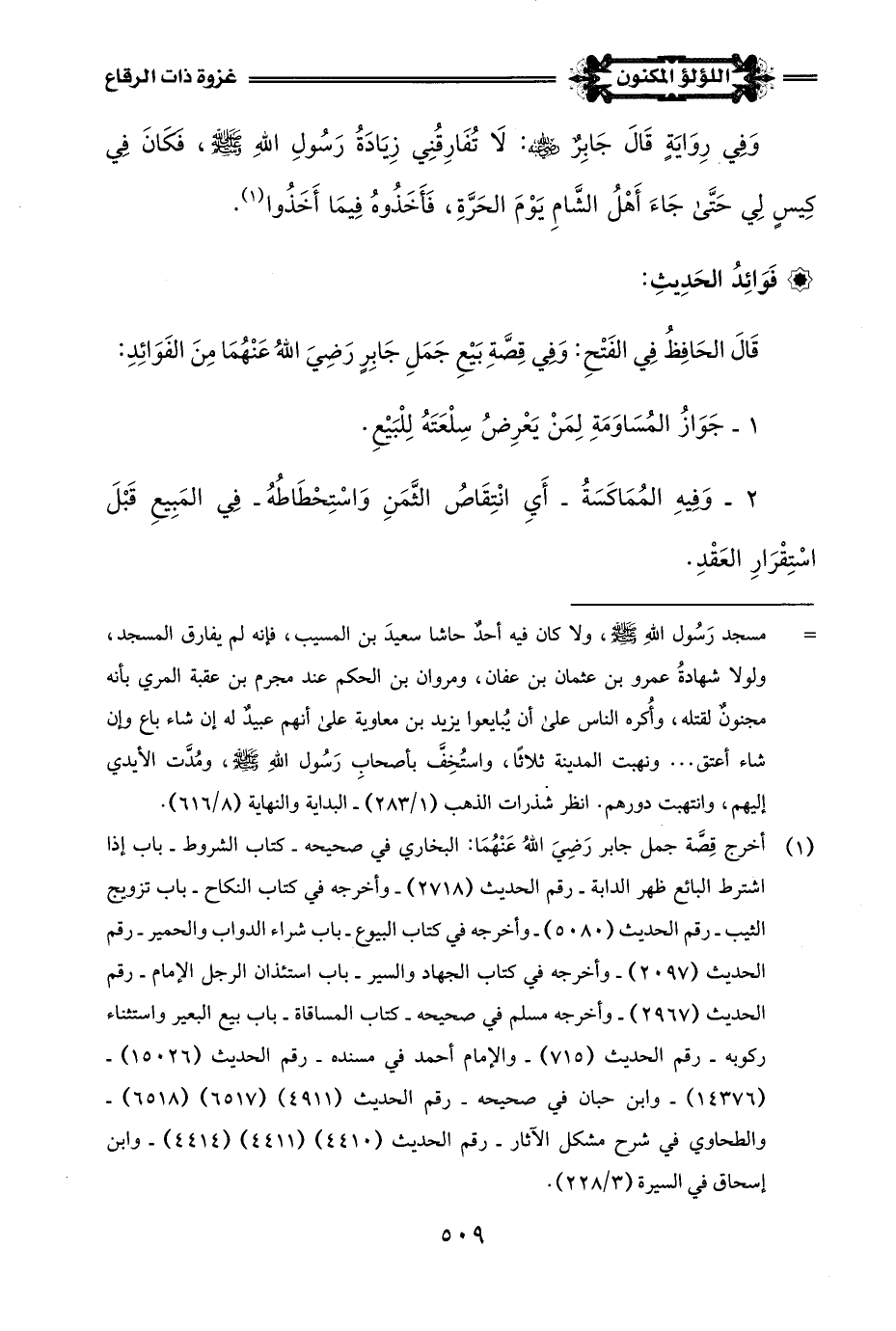 (¬1) أخرج قِصَّة جمل جابر رَضِيَ اللَّهُ عَنْهُمَا: البخاري في صحيحه - كتاب الشروط - باب إذا اشترط البائع ظهر الدابة - رقم الحديث (2718) - وأخرجه في كتاب النكاح - باب تزويج الثيب - رقم الحديث (5080) - وأخرجه في كتاب البيوع - باب شراء الدواب والحمير - رقم الحديث (2097) - وأخرجه في كتاب الجهاد والسير - باب استئذان الرَّجل الإِمام - رقم الحديث (2967) - وأخرجه مسلم في صحيحه - كتاب المساقاة - باب بيع البعير واستثناء ركوبه - رقم الحديث (715) - والإمام أحمد في مسنده - رقم الحديث (15026) - (14376) - وابن حبان في صحيحه - رقم الحديث (4911) (6517) (6518) - والطحاوي في شرح مشكل الآثار - رقم الحديث (4410) (4411) (4414) - وابن إسحاق في السيرة (3/ 228).