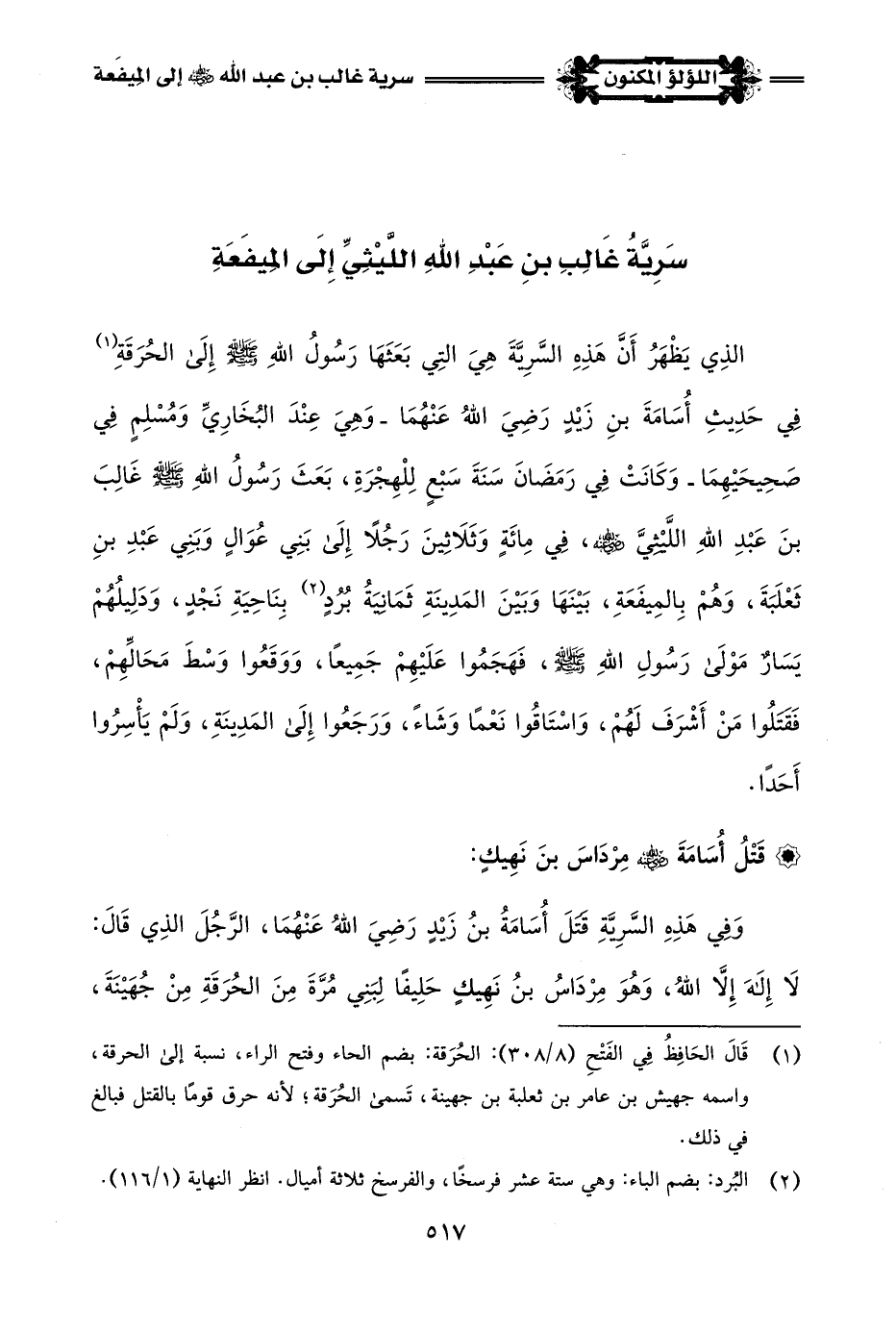 الذِي يَظْهَرُ أَنَّ هَذِهِ السَّرِيَّةَ هِيَ التِي بَعَثَهَا رَسُولُ اللَّهِ -صلى اللَّه عليه وسلم- إلى الحُرَقَةِ (¬1) في حَدِيثِ أُسَامَةَ بنِ زَيْدٍ رَضِيَ اللَّهُ عَنْهُمَا -وَهِيَ عِنْدَ البُخَارِيِّ وَمُسْلِمٍ في صَحِيحَيْهِمَا- وَكَانَتْ في رَمَضَانَ سَنَةَ سَبْعٍ لِلْهِجْرَةِ، بَعَثَ رَسُولُ اللَّهِ -صلى اللَّه عليه وسلم- غَالِبَ بنَ عَبْدِ اللَّهِ اللَّيْثِيَّ -رضي اللَّه عنه-، في مِائَةٍ وَثَلَاثِينَ رَجُلًا إلى بَنِي عُوَالٍ وَبَنِي عَبْدِ بنِ ثَعْلَبَةَ، وَهُمْ بِالمِيفَعَةِ، بَيْنَهَا وَبَيْنَ المَدِينَةِ ثَمَانِيَةُ بُرُدٍ (¬2) بِنَاحِيَةِ نَجْدٍ، وَدَلِيلُهُمْ يَسَارٌ مَوْلَى رَسُولِ اللَّهِ -صلى اللَّه عليه وسلم-، فَهَجَمُوا عَلَيْهِمْ جَمِيعًا، وَوَقَعُوا وَسْطَ مَحَالِّهِمْ، فَقتَلُوا مَنْ أَشْرَفَ لَهُمْ، وَاسْتَاقُوا نَعْمًا وَشَاءً، وَرَجَعُوا إلى المَدِينَةِ، وَلَمْ يَأْسِرُوا أَحَدًا.