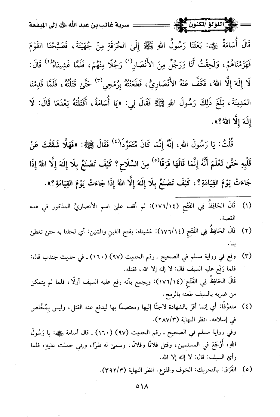 قَالَ أُسَامَةُ -رضي اللَّه عنه-: بَعَثَنَا رَسُولُ اللَّهِ -صلى اللَّه عليه وسلم- إلى الحُرَقَةِ مِنْ جُهَيْنَةَ، فَصَبَّحْنَا القَوْمَ فَهَزَمْنَاهُمْ، وَلَحِقْتُ أَنَا وَرَجُلٌ مِنَ الأَنْصَارِ (¬1) رَجُلًا مِنْهُمْ، فَلَمَّا غَشِينَاهُ (¬2) قَالَ: لَا إِلَهَ إِلَّا اللَّهُ، فكَفَّ عَنْهُ الأَنْصَارِيُّ، فَطَعَنْتُهُ بِرُمْحِي (¬3) حَتَّى قَتَلْتُهُ، فَلَمَّا قَدِمْنَا المَدِينَةَ، بَلَغَ ذَلِكَ رَسُولَ اللَّهِ -صلى اللَّه عليه وسلم- فَقَالَ لِي: "يَا أُسَامَةُ، أَقَتَلْتَهُ بَعْدَمَا قَالَ: لَا إِلَهَ إِلَّا اللَّهُ؟ ".