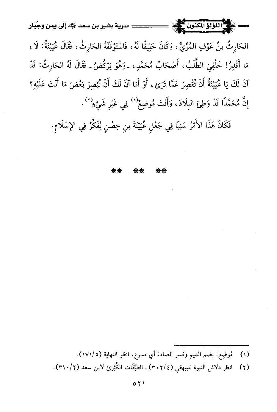 الحَارِثُ بنُ عَوْفٍ المُرِّيّ، وَكَانَ حَلِيفًا لَهُ، فَاسْتَوْقَفَهُ الحَارِثُ، فَقَالَ عُيَيْنَةُ: لَا، مَا أَقْدِرُ! خَلْفِيَ الطَّلَبُ، أَصْحَابُ مُحَمَّدٍ، -وَهُوَ يَرْكُضُ- فَقَالَ لَهُ الحَارِثُ: قَدْ آنَ لَكَ يَا عُيَيْنَةُ أَنْ تُقْصِرَ عَمَّا تَرَى، أَوْ أَمَا آنَ لَكَ أَنْ تُبْصِرَ بَعْضَ مَا أَنْتَ عَلَيْهِ؟ إِنَّ مُحَمَّدًا قَدْ وَطِئَ البِلَادَ، وَأَنْتَ مُوضِعٌ (¬1) في غَيْرِ شَيْءٍ (¬2).