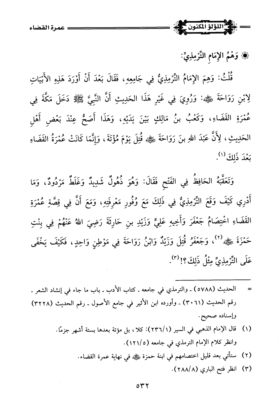 وَتَعَقَّبَهُ الحَافِظُ في الفَتْحِ فَقَالَ: وَهُوَ ذُهُولٌ شَدِيدٌ وَغَلَطٌ مَرْدُودٌ، وَمَا أَدْرِي كَيْفَ وَقَعَ التِّرْمِذِيُّ في ذَلِكَ مَعَ وُفُورِ مَعْرِفَتِهِ، وَمَعَ أَنَّ في قِصَّةِ عُمْرَةِ القَضَاءَ اخْتِصَامُ جَعْفَرَ وَأَخِيهِ عَلِيٍّ وَزَيْدِ بنِ حَارِثَةَ رَضِيَ اللَّهُ عَنْهُمْ في بِنْتِ حَمْزَةَ -رضي اللَّه عنه- (¬2)، وَجَعْفَرُ قُتِلَ وَزَيْدٌ وَابْنُ رَوَاحَةَ في مَوْطِنٍ وَاحِدٍ، فَكَيْفَ يَخْفَى عَلَى التِّرْمِذِيِّ مِثْلُ ذَلِكَ؟ ! (¬3).