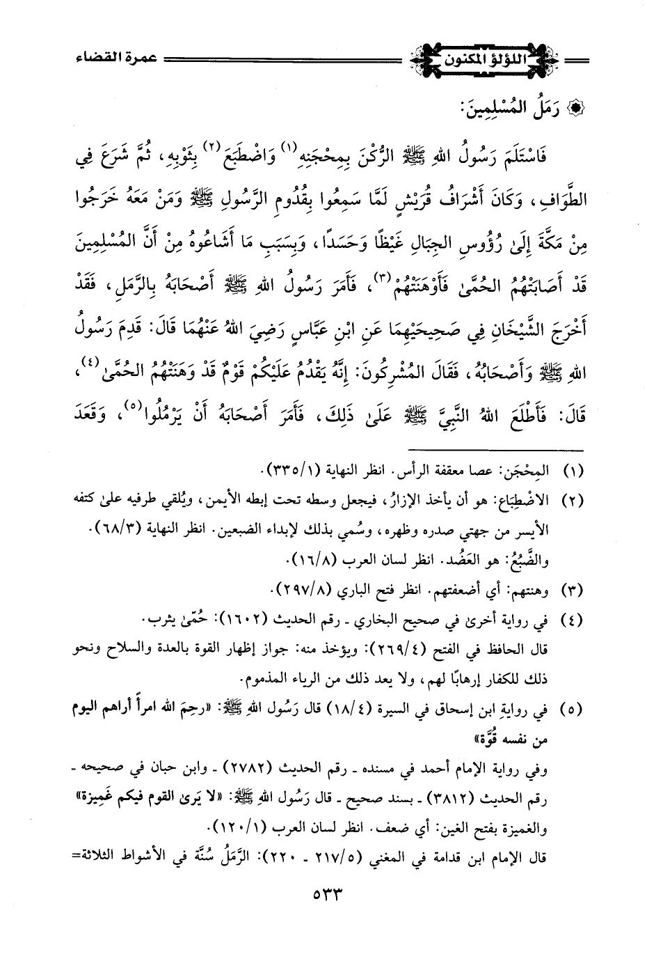 قال الإِمام ابن قدامة في المغني (5/ 217 - 220): الرَّمَلُ سُنَّة في الأشواط الثلاثة =