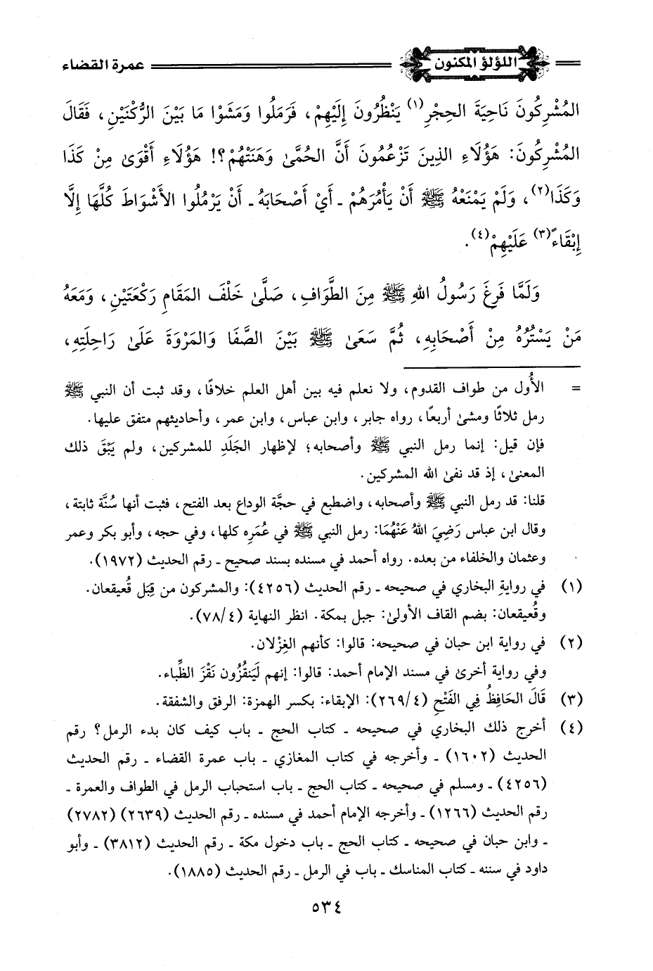 (¬4) أخرج ذلك البخاري في صحيحه - كتاب الحج - باب كيف كان بدء الرمل؟ رقم الحديث (1602) - وأخرجه في كتاب المغازي - باب عمرة القضاء - رقم الحديث (4256) - ومسلم في صحيحه - كتاب الحج - باب استحباب الرمل في الطواف والعمرة - رقم الحديث (1266) - وأخرجه الإِمام أحمد في مسنده - رقم الحديث (2639) (2782) - وابن حبان في صحيحه - كتاب الحج - باب دخول مكة - رقم الحديث (3812) - وأبو داود في سننه - كتاب المناسك - باب في الرمل - رقم الحديث (1885).