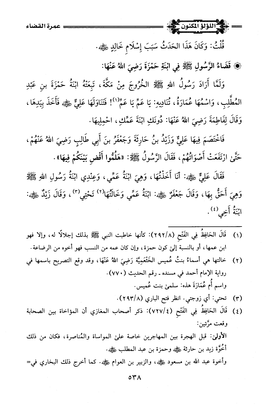 فَقَالَ عَلِيٌّ -رضي اللَّه عنه-: أَنَا أَخَذْتُهَا، وَهِيَ ابْنَةُ عَمِّي، وَعِنْدِي ابْنَةُ رَسُولِ اللَّهِ -صلى اللَّه عليه وسلم- وَهِيَ أَحَقُّ بِهَا، وَقَالَ جَعْفَرٌ -رضي اللَّه عنه-: ابْنَةُ عَمِّي وَخَالَتُهَا (¬2) تَحْتِي (¬3)، وَقَالَ زَيْدٌ -رضي اللَّه عنه-: ابْنَةُ أَخِي (¬4).