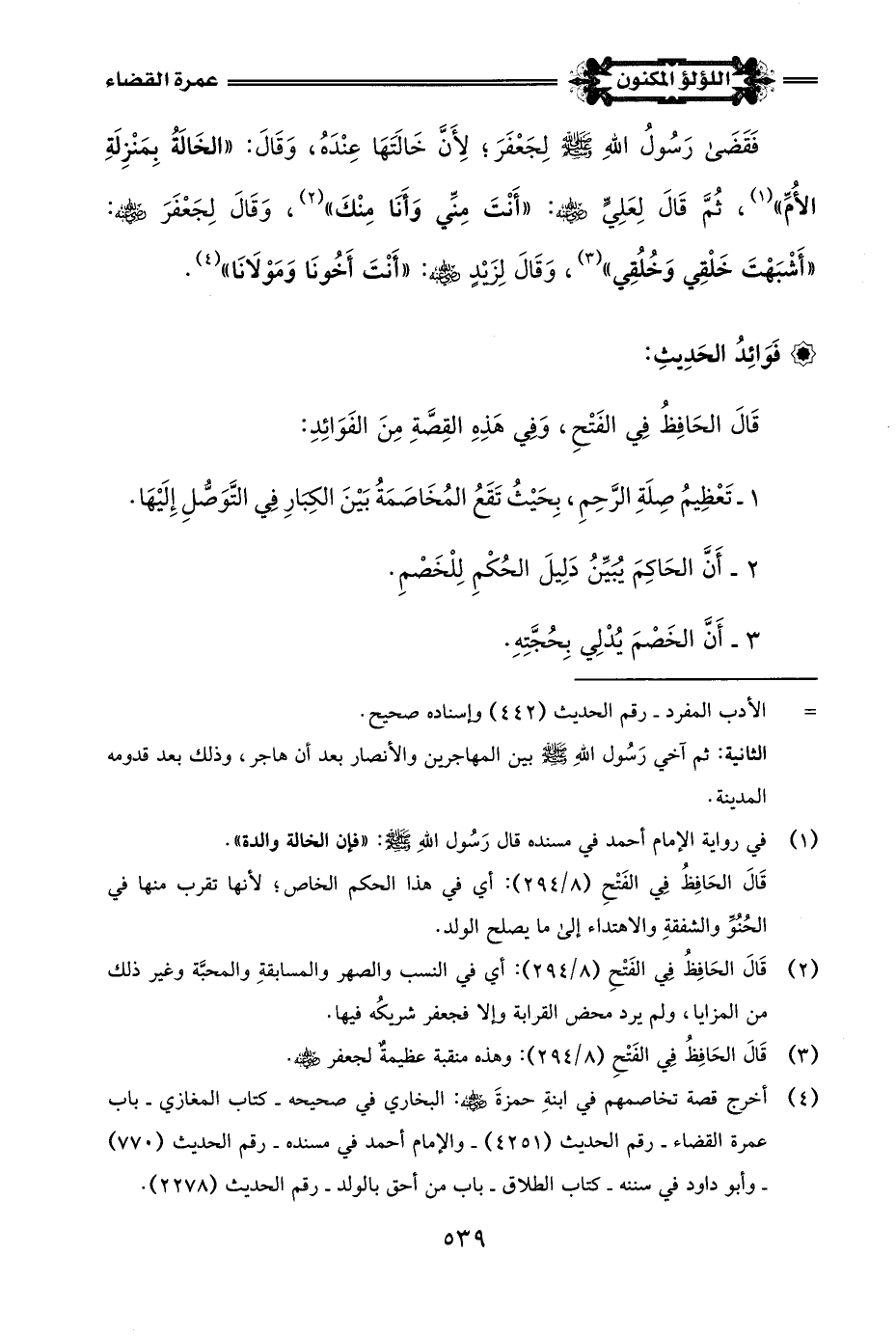 (¬4) أخرج قصة تخاصمهم في ابنةِ حمزةَ -رضي اللَّه عنه-: البخاري في صحيحه - كتاب المغازي - باب عمرة القضاء - رقم الحديث (4251) - والإمام أحمد في مسنده - رقم الحديث (770) - وأبو داود في سننه - كتاب الطلاق - باب من أحق بالولد - رقم الحديث (2278).