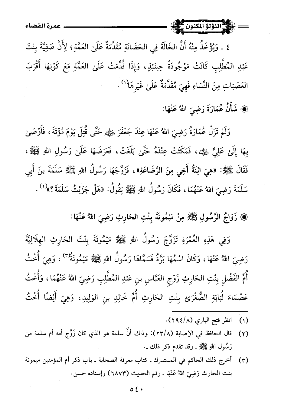 وَفِي هَذِهِ العُمْرَةِ تَزَوَّجَ رَسُولُ اللَّهِ -صلى اللَّه عليه وسلم- مَيْمُونَةَ بِنْتَ الحَارِثِ الهِلَالِيَّةَ رَضِيَ اللَّهُ عَنْهَا، وَكَانَ اسْمُهَا بَرَّةُ فَسَمَّاهَا رَسُولُ اللَّهِ -صلى اللَّه عليه وسلم- مَيْمُونَةُ (¬3)، وَهِيَ أُخْتُ أُمِّ الفَضْلِ بِنْتِ الحَارِثِ زَوْجِ العَبَّاسِ بنِ عَبْدِ المُطَّلِبِ رَضِيَ اللَّهُ عَنْهُمَا، وَأُخْتُ عَصْمَاءَ لُبَابَةِ الصُّغْرَى بِنْتِ الحَارِثِ أُمِّ خَالِدٍ بنِ الوَليدِ، وَهِيَ أَيْضًا أُخْتُ