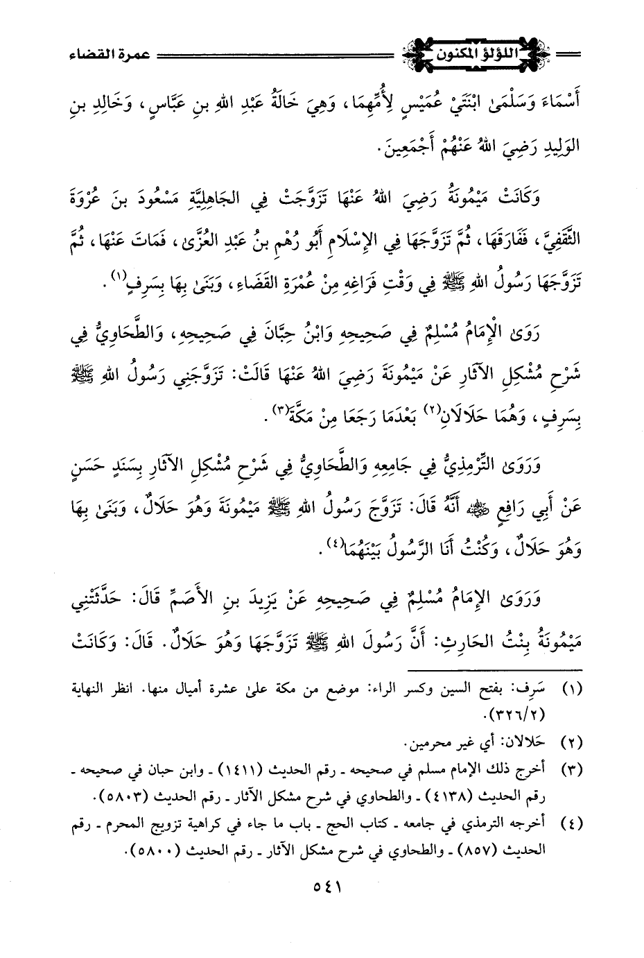 رَوَى الْإِمَامُ مُسْلِمٌ في صَحِيحِهِ وَابْنُ حِبَّانَ في صَحِيحِهِ، وَالطَّحَاوِيُّ في شَرْحِ مُشْكِلِ الآثَارِ عَنْ مَيْمُونَةَ رَضِيَ اللَّهُ عَنْهَا قَالَتْ: تَزَوَّجَنِي رَسُولُ اللَّهِ -صلى اللَّه عليه وسلم- بِسَرِفٍ، وَهُمَا حَلَالَانِ (¬2) بَعْدَمَا رَجَعَا مِنْ مَكَّةَ (¬3).