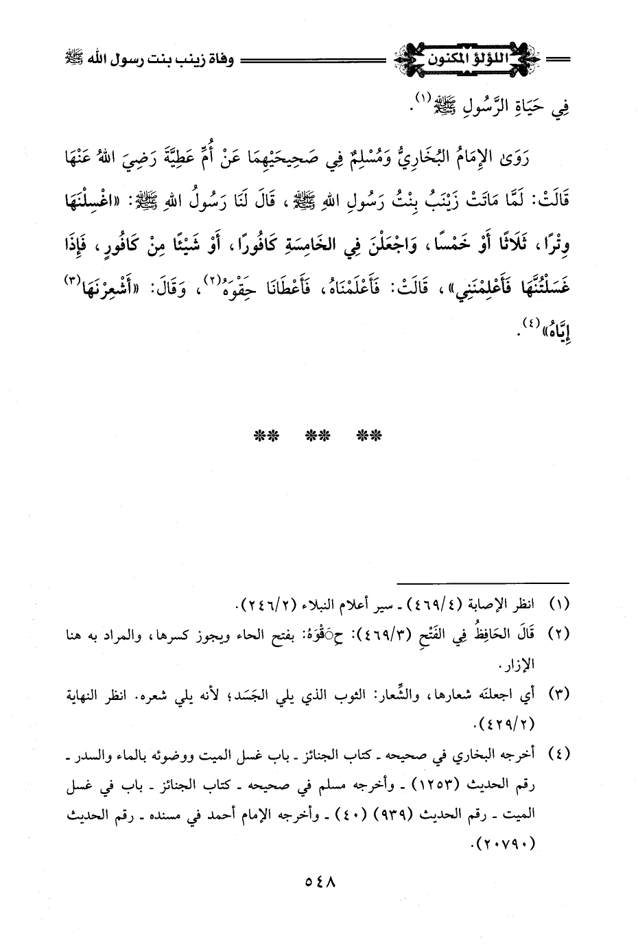 (¬4) أخرجه البخاري في صحيحه - كتاب الجنائز - باب غسل الميت ووضوئه بالماء والسدر - رقم الحديث (1253) - وأخرجه مسلم في صحيحه - كتاب الجنائز - باب في غسل الميت - رقم الحديث (939) (40) - وأخرجه الإمام أحمد في مسنده - رقم الحديث (20790).