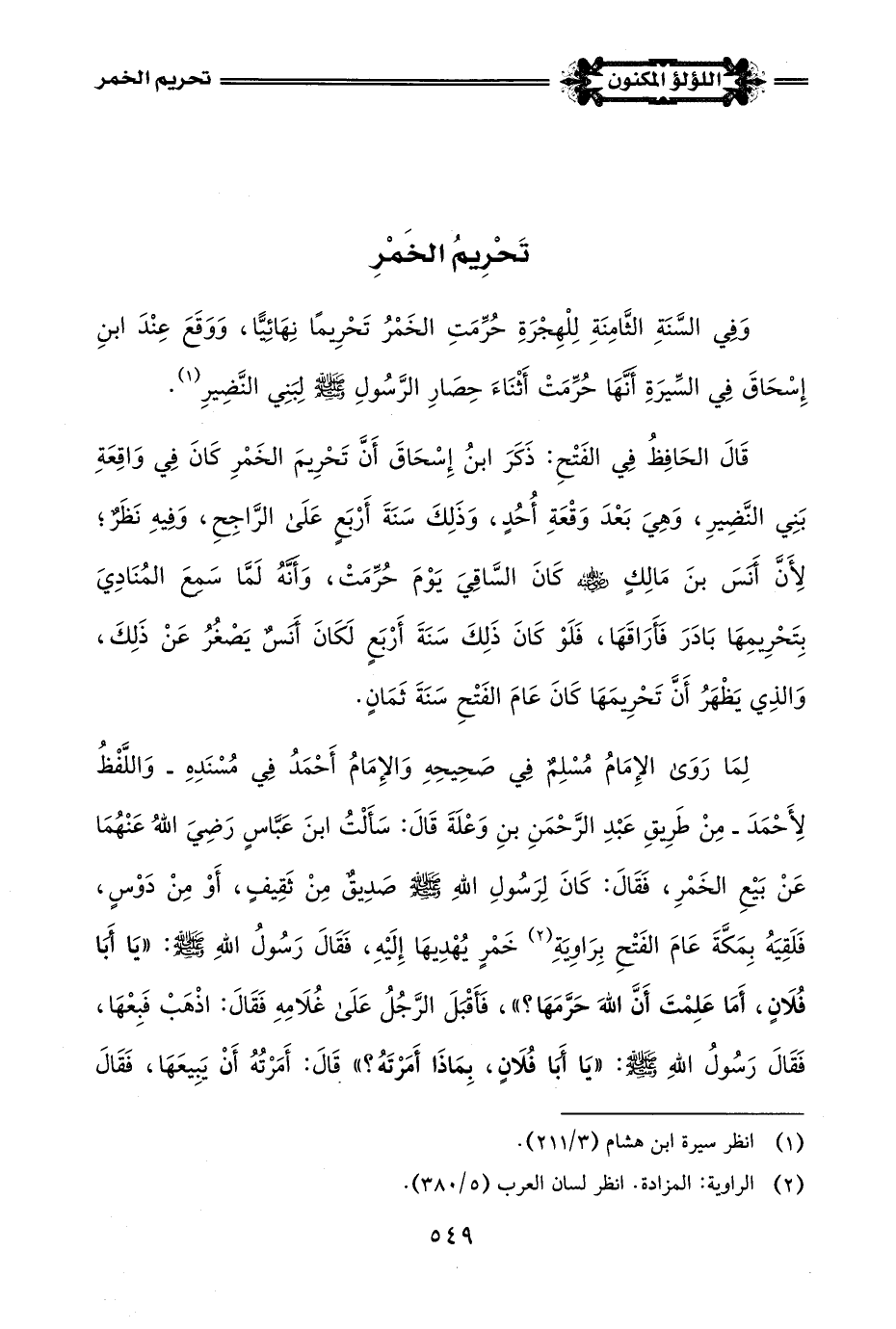 قَالَ الحَافِظُ فِي الفَتْحِ: ذَكَرَ ابنُ إِسْحَاقَ أَنَّ تَحْرِيمَ الخَمْرِ كَانَ فِي وَاقِعَةِ بَنِي النَّضِيرِ، وَهِيَ بَعْدَ وَقْعَةِ أُحُدٍ، وَذَلِكَ سَنَةَ أَرْبَعٍ عَلَى الرَّاجِحِ، وَفِيهِ نَظَرٌ؛ لِأَنَّ أَنَسَ بنَ مَالِكٍ -رضي اللَّه عنه- كَانَ السَّاقِيَ يَوْمَ حُرِّمَتْ، وَأَنَّهُ لَمَّا سَمِعَ المُنَاديَ بِتَحْرِيمِهَا بَادَرَ فَأَرَاقَهَا، فَلَوْ كَانَ ذَلِكَ سَنَةَ أَرْبَعٍ لَكَانَ أَنَسٌ يَصْغُرُ عَنْ ذَلِكَ، وَالذِي يَظْهَرُ أَنَّ تَحْرِيمَهَا كَانَ عَامَ الفَتْحِ سَنَةَ ثَمَانٍ.