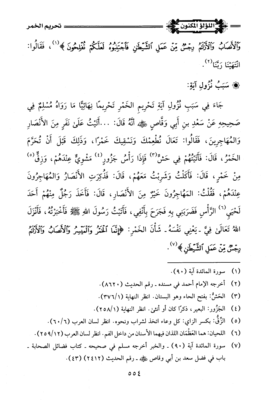جَاءَ فِي سَبَبِ نزُولِ آيَةِ تَحْرِيمِ الخَمْرِ تَحْرِيمًا نِهَائِيًّا مَا رَوَاهُ مُسْلِمٌ فِي صَحِيحِهِ عَنْ سَعْدِ بنِ أَبِي وَقَّاصٍ -رضي اللَّه عنه- أَنَّهُ قَالَ: . . . أَتَيْتُ عَلَى نَفَرٍ مِنَ الأَنْصَارِ وَالمُهَاجِرِينَ، فَقَالُوا: تَعَالَ نُطْعِمْكَ وَنَسْقِيكَ خَمْرًا، وَذَلِكَ قَبْلَ أَنْ تُحَرَّمَ الخَمْرُ، قَالَ: فَأَتَيْتُهُمْ فِي حَشٍّ (¬3) فَإِذَا رَأْسُ جَزُورٍ (¬4) مَشْوِيٌّ عِنْدَهُمْ، وَزِقٌّ (¬5) مِنْ خَمْرٍ، قَالَ: فَأَكَلْتُ وَشَرِبْتُ مَعَهُمْ، قَالَ: فَذُكِرَتِ الأَنْصَارُ وَالمُهَاجِرُونَ عِنْدَهُمْ، فَقُلْتُ: المَهُاجِرُونَ خَيْر مِنَ الأَنْصَارِ، قَالَ: فَأَخَذَ رَجُلٌ مِنْهُمْ أَحَدَ لَحْيَيِ (¬6) الرَّأْسِ فَضَرَبَنِي بِهِ فَجَرَحَ بِأَنْفِي، فَأَتَيْتُ رَسُولَ اللَّهِ -صلى اللَّه عليه وسلم- فَأَخْبَرتُهُ، فَأَنْزَلَ اللَّهُ تَعَالَى فِيَّ -يَعْنِي نَفْسَهُ- شَأْنَ الخَمْرِ: {يَاأَيُّهَا الَّذِينَ آمَنُوا إِنَّمَا الْخَمْرُ وَالْمَيْسِرُ وَالْأَنْصَابُ وَالْأَزْلَامُ رِجْسٌ مِنْ عَمَلِ الشَّيْطَانِ} (¬7).