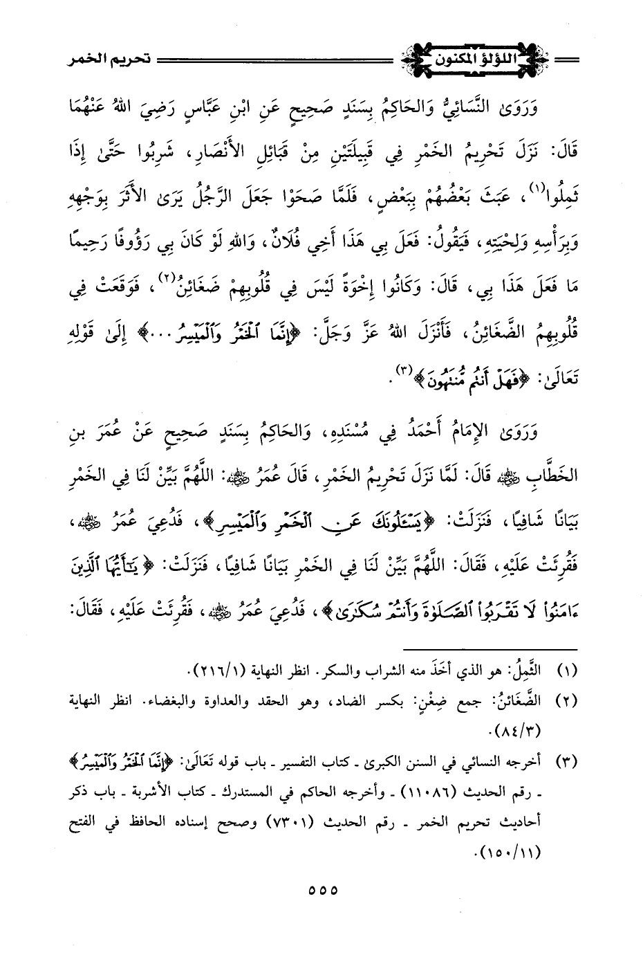 (¬3) أخرجه النسائي في السنن الكبرى - كتاب التفسير - باب قوله تَعَالَى: {إِنَّمَا الْخَمْرُ وَالْمَيْسِرُ} - رقم الحديث (11086) - وأخرجه الحاكم في المستدرك - كتاب الأشربة - باب ذكر أحاديث تحريم الخمر - رقم الحديث (7301) وصحح إسناده الحافظ في الفتح (11/ 150).