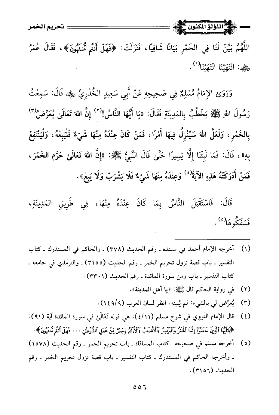 (¬5) أخرجه مسلم في صحيحه - كتاب المساقاة - باب تحريم الخمر - رقم الحديث (1578) - وأخرجه الحاكم في المستدرك - كتاب التفسير - باب قصة نزول تحريم الخمر - رقم الحديث (3156).