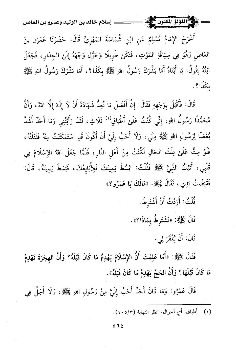 قَالَ: فَأَقْتلَ بِوَجْهِهِ فَقَالَ: إِنَّ أَفْضَلَ مَا نُعِدُّ شَهَادَةَ أَنْ لَا إِلَهَ إِلَّا اللَّهُ، وَأَنَّ مُحَمَّدًا رَسُولُ اللَّهِ، إِنِّي كُنْتُ عَلَى أَطْبَاقٍ (¬1) ثَلَاثٍ، لَقَدْ رَأَيْتُنِي وَمَا أَحَدٌ أَشَدَّ بُغْضًا لِرَسُولِ اللَّهِ -صلى اللَّه عليه وسلم- مِنِّي، وَلَا أَحَبَّ إِلَيَّ أَنْ أَكُونَ قَدِ اسْتَمْكَنْتُ مِنْهُ فَقتَلْتُهُ، فَلَوْ مِتُّ عَلَى تِلْكَ الحَالِ لَكُنْتُ مِنْ أَهْلِ النَّارِ، فَلَمَّا جَعَلَ اللَّهُ الإِسْلَامَ فِي قَلْبِي، أَتيْتُ النَّبِيَّ -صلى اللَّه عليه وسلم- فَقُلْتُ: ابْسُطْ يَمِينَكَ فَلِأبايِعُكَ، فبسَطَ يَمِينَهُ، قَالَ: فَقَبَضْتُ يَدِي، فَقَالَ -صلى اللَّه عليه وسلم-: "مَالَكَ يَا عَمْرُو؟ "