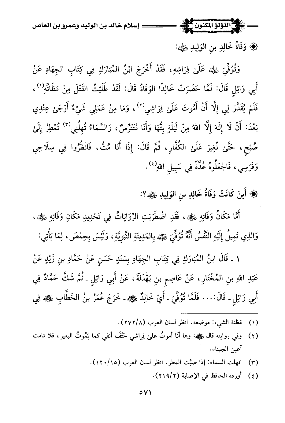 1 - قَالَ ابنُ المبارَكِ فِي كِتَابِ الجِهَادِ بِسَنَدٍ حَسَنٍ عَنْ حَمَّادِ بنِ زَيْدٍ عَنْ عَبْدِ اللَّهِ بنِ المُخْتَارِ، عَنْ عَاصِمِ بنِ بَهْدَلة، عَنْ أَبِي وَائِلٍ -ثُمَّ شَكَّ حَمَّادٌ فِي أَبِي وَائِلٍ- قَالَ: . . . فَلَمَّا تُوُفِّيَ -أَيْ خَالِد -رضي اللَّه عنه- خَرَجَ عُمَرُ بنُ الخَطَّابِ -رضي اللَّه عنه- فِي