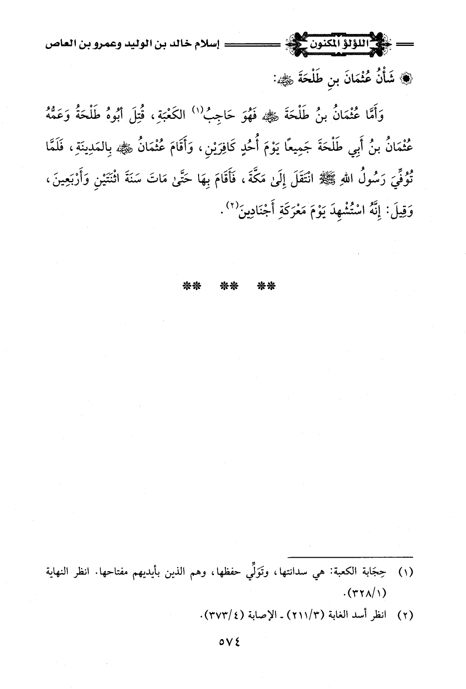 وَأَمَّا عُثْمَانُ بنُ طَلْحَةَ -رضي اللَّه عنه- فَهُوَ حَاجِبُ (¬1) الكَعْبَةِ، قُتِلَ أبُوهُ طَلْحَةُ وَعَمُّهُ عُثْمَانُ بنُ أَبِي طَلْحَةَ جَمِيعًا يَوْمَ أُحُدٍ كَافِرَيْنِ، وَأَقَامَ عُثْمَانُ -رضي اللَّه عنه- بِالمَدِينَةِ، فَلَمَّا تُوُفِّيَ رَسُولُ اللَّهِ -صلى اللَّه عليه وسلم- انْتَقَلَ إِلَى مَكَّةَ، فَأَقَامَ بِهَا حَتَّى مَاتَ سَنَةَ اثْنَتَيْنِ وَأَرْبَعِينَ، وَقِيلَ: إِنَّهُ اسْتُشْهِدَ يَوْمَ مَعْرَكَةِ أَجْنَادِينَ (¬2).