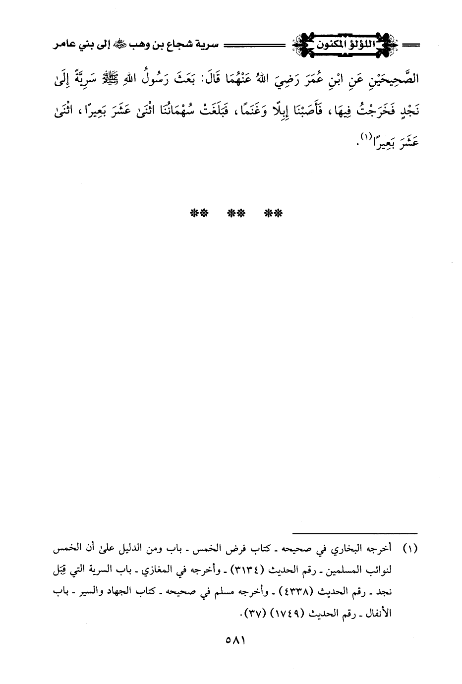 (¬1) أخرجه البخاري في صحيحه - كتاب فرض الخمس - باب ومن الدليل على أن الخمس لنوائب المسلمين - رقم الحديث (3134) - وأخرجه في المغازي - باب السرية التي قِبَل نجد - رقم الحديث (4338) - وأخرجه مسلم في صحيحه - كتاب الجهاد والسير - باب الأنفال - رقم الحديث (1749) (37).