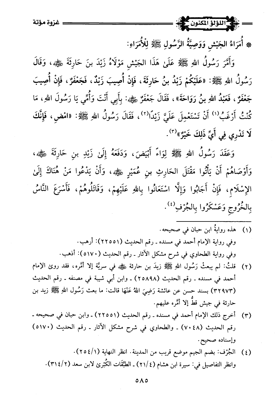 (¬2) قلتُ: لم يبعثْ رَسُول اللَّهِ -صلى اللَّه عليه وسلم- زيدَ بن حارثة -رضي اللَّه عنه- في سريَّة إلا أمَّره، فقد روى الإمام أحمد في مسنده - رقم الحديث (25898) - وابن أبي شيبة في مصنفه - رقم الحديث (32973) بسند حسن عن عائشة رَضِيَ اللَّهُ عَنْهَا قالت: ما بعث رَسُول اللَّهِ -صلى اللَّه عليه وسلم- زيد بن حارثة في جيش قطُّ إلا أمَّره عليهم.