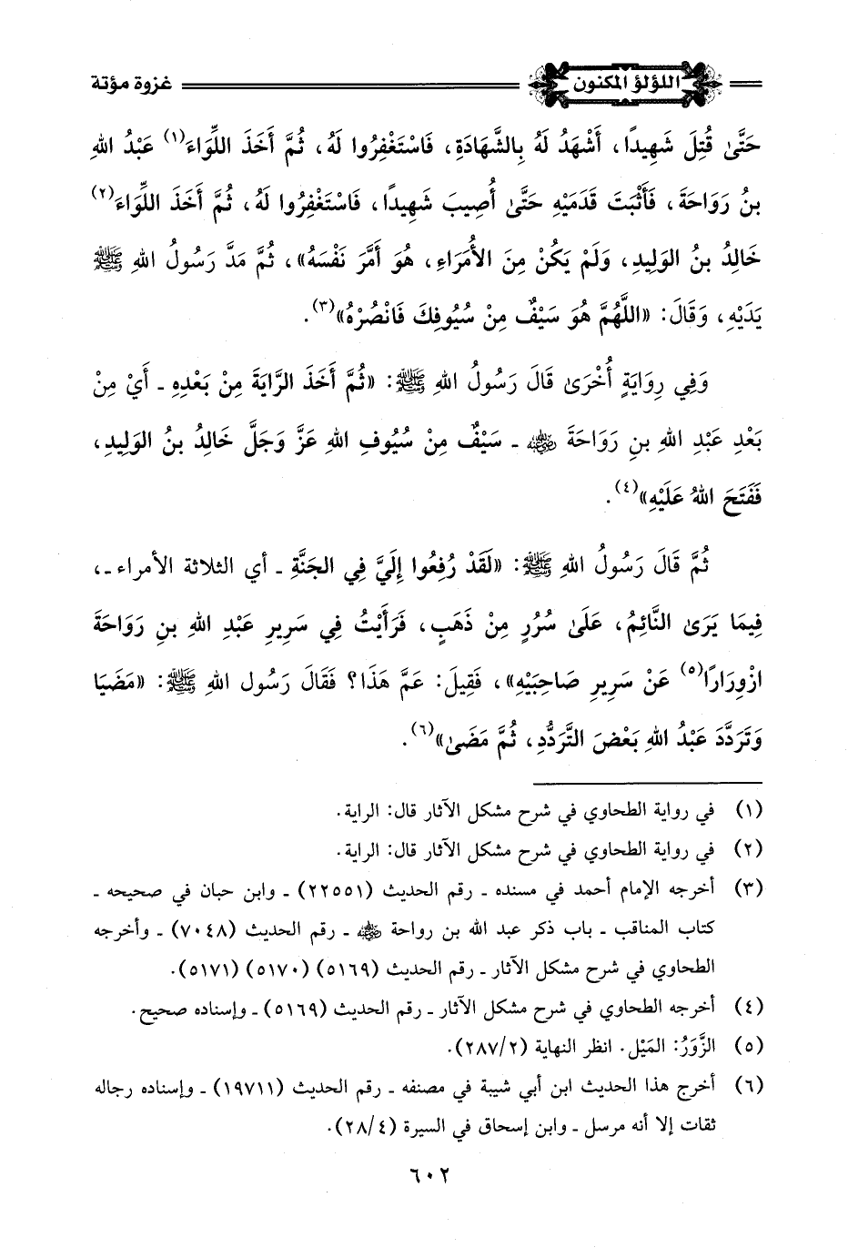 (¬3) أخرجه الإمام أحمد في مسنده - رقم الحديث (22551) - وابن حبان في صحيحه - كتاب المناقب - باب ذكر عبد اللَّه بن رواحة -رضي اللَّه عنه- رقم الحديث (7048) - وأخرجه الطحاوي في شرح مشكل الآثار - رقم الحديث (5169) (5170) (5171).