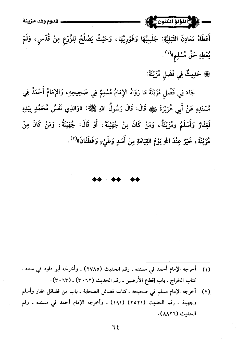وَفِي رَجَبٍ مِنَ السَّنَةِ الخَامِسَةِ لِلْهِجْرَةِ قَدِمَ عَلَى رَسُولِ اللَّهِ -صلى اللَّه عليه وسلم- أَرْبَعُمِائَةِ رَجُلٍ مِنْ مُزَيْنَةَ، فِيهِمُ: النُّعْمَانُ بنُ مُقَرِّنٍ، وَقُرَّةُ بنُ إِيَاسٍ، وَبِلَالُ بنُ الحَارِثِ، فَبَايَعَهُمْ رَسُولُ اللَّهِ -صلى اللَّه عليه وسلم- عَلَى الإِسْلَامِ، وَجَعَلَ لَهُمْ رَسُولُ اللَّهِ -صلى اللَّه عليه وسلم- الهِجْرَةَ في دَارِهِمْ، وَقَالَ: "أَنْتُمْ مُهَاجِرُونَ حَيْثُ كُنْتُمْ، فَارْجِعُوا إِلَى أَمْوَالِكُمْ"، فَرَجَعُوا إِلَى بِلَادِهِمْ (¬1).