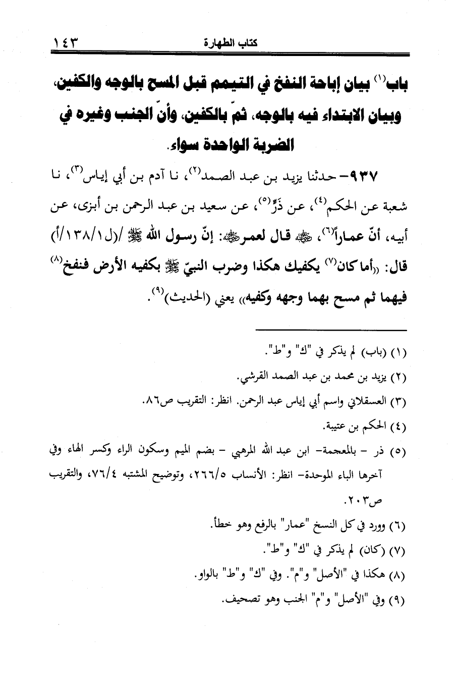 937 - حدثنا يزيد بن عبد الصمد (¬1)، نا آدم بن أبي إياس (¬2)، نا شعبة عن الحكم (¬3)، عن ذَرٍّ (¬4)، عن سعيد بن عبد الرحمن بن أبزى، عن أبيه، أنّ عمارًا (¬5)، -رضي الله عنه- قال لعمر -رضي الله عنه-: إنّ رسول الله -صلى الله عليه وسلم- قال: "أما كان (¬6) يكفيك هكذا وضرب النبيّ -صلى الله عليه وسلم- بكفيه الأرض فنفخ (¬7) فيهما ثم مسح بهما وجهه وكفيه" يعني (الحديث) (¬8).
