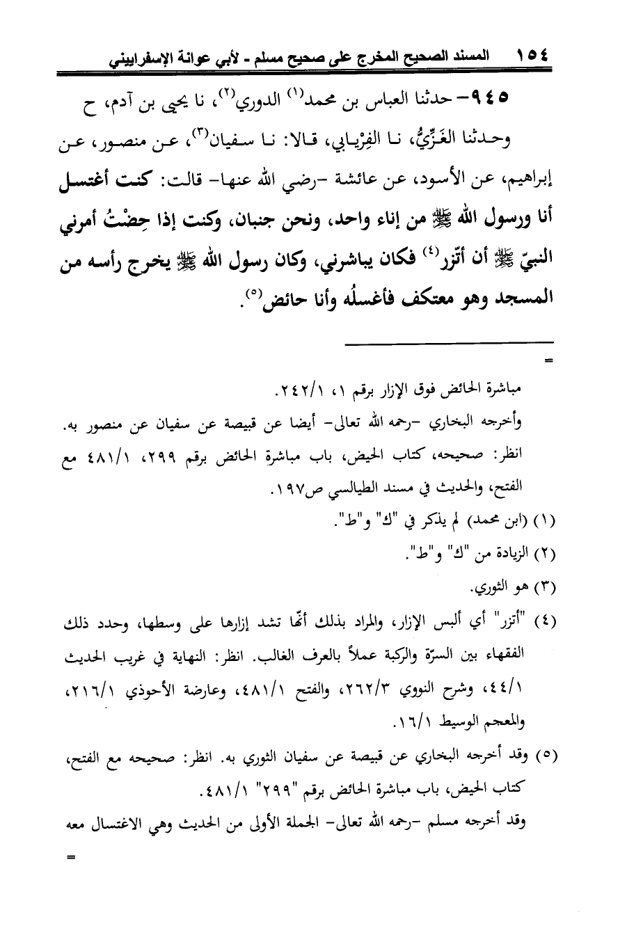 (¬5) وقد أخرجه البخاري عن قبيصة عن سفيان الثوري به. انظر: صحيحه مع الفتح، كتاب الحيض، باب مباشرة الحائض برقم "299" 1/ 481.