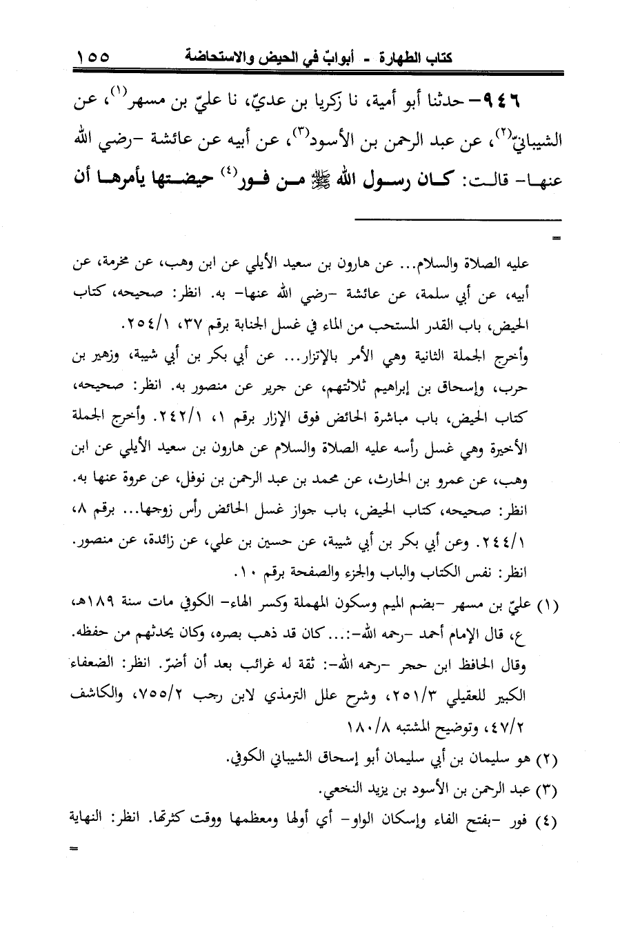 946 - حدثنا أبو أمية، نا زكريا بن عديّ، نا عليّ بن مسهر (¬1)، عن الشيبانيّ (¬2)، عن عبد الرحمن بن الأسود (¬3)، عن أبيه عن عائشة -رضي الله عنها- قالت: كان رسول الله -صلى الله عليه وسلم- من فور (¬4) حيضتها يأمرها أن