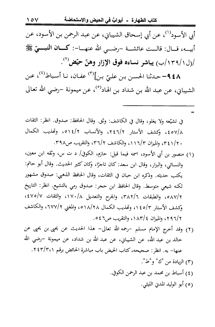 وأخرجه البخاري -رحمه الله تعالى- عن أبي النعمان عن عبد الواحد عن الشيباني. انظر: صحيحه، كتاب الحيض باب مباشرة الحائض برقم 303، 1/ 482 مع الفتح، وكأن الشيباني كان يحدث به تارة من مسند عائشة وتارة من مسند ميمونة ... انظر: الفتح 1/ 483.