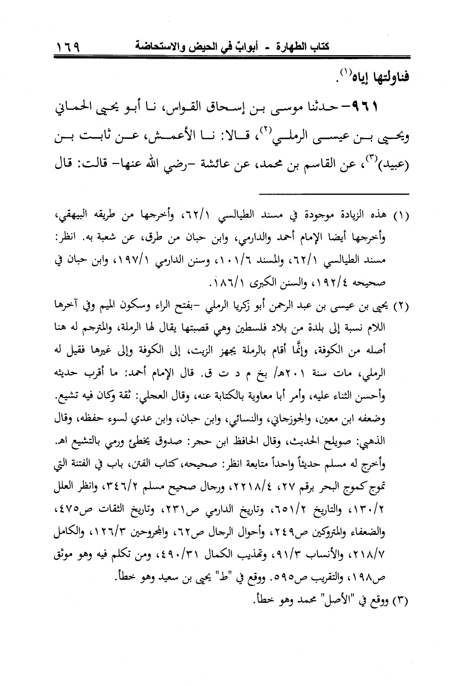 (¬1) يحيى بن عيسى بن عبد الرحمن أبو زكريا الرملي -بفتح الراء وسكون الميم وفي آخرها اللام نسبة إلى بلدة من بلاد فلسطين وهي قصبتها يقال لها الرملة، والمترجم له هنا أصله من الكوفة، وإنَّما أقام بالرملة يجهز الزيت، إلى الكوفة وإلى غيرها فقيل له الرملي، مات سنة 201 هـ / بخ م د ت ق. قال الإمام أحمد: ما أقرب حديثه وأحسن الثناء عليه، وأمر أبا معاوية بالكتابة عنه، وقال العجلي: ثقة وكان فيه تشيع. وضعفه ابن معين، والجوزجاني، والنسائي، وابن حبان، وابن عدي لسوء حفظه، وقال الذهبي: صويلح الحديث، وقال الحافظ ابن حجر: صدوق يخطئ ورمي بالتشيع اهـ. وأخرج له مسلم حديثًا واحدًا متابعة انظر: صحيحه، كتاب الفتن، باب في الفتنة التي تموج كموج البحر برقم 27، 4/ 2218، ورجال صحيح مسلم 2/ 346، وانظر العلل 2/ 130، والتاريخ 2/ 651، وتاريخ الدارمي ص 231، وتاريخ الثقات ص 475، والضعفاء والمتروكين ص 249، وأحوال الرجال ص 62، والمجروحين 3/ 126، والكامل 7/ 218، والأنساب 3/ 91، وتهذيب الكمال 31/ 490، ومن تكلم فيه وهو موثق ص 198، والتقريب ص 595. ووقع في "ط" يحيى بن سعيد وهو خطأ.