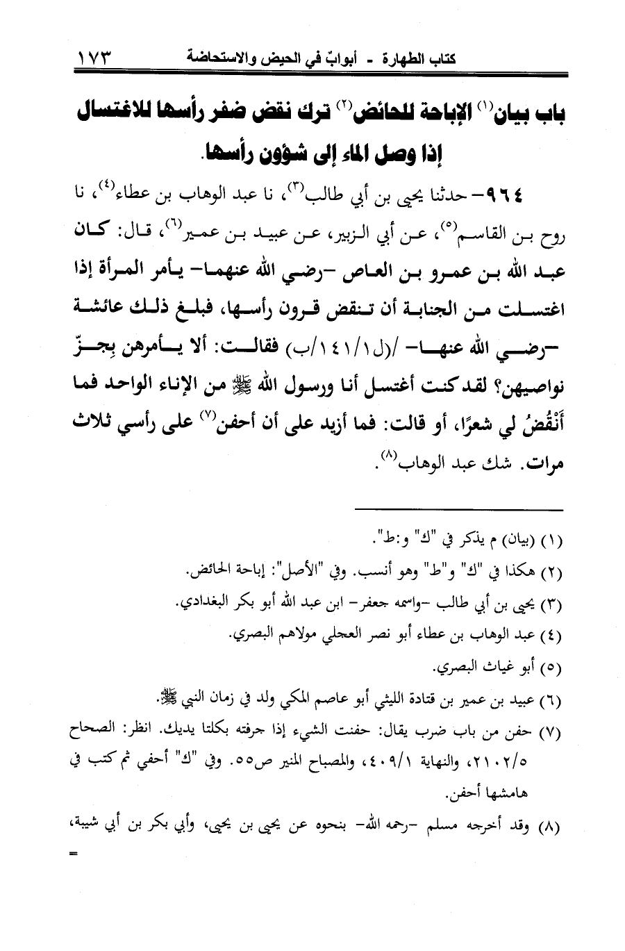964 - حدثنا يحيى بن أبي طالب (¬1)، نا عبد الوهاب بن عطاء (¬2)، نا روح بن القاسم (¬3)، عن أبي الزبير، عن عبيد بن عمير (¬4)، قال: كان عبد الله بن عمرو بن العاص -رضي الله عنهما- يأمر المرأة إذا اغتسلت من الجنابة أن تنقض قرون رأسها، فبلغ ذلك عائشة -رضي الله عنها- فقالت: ألا يأمرهن بِجزّ نواصيهن؟ لقد كنت أغتسل أنا ورسول الله -صلى الله عليه وسلم- من الإناء الواحد فما أَنْقُضُ لي شعرًا، أو قالت: فما أزيد على أن أحفن (¬5) على رأسي ثلاث مرات. شك عبد الوهاب (¬6).