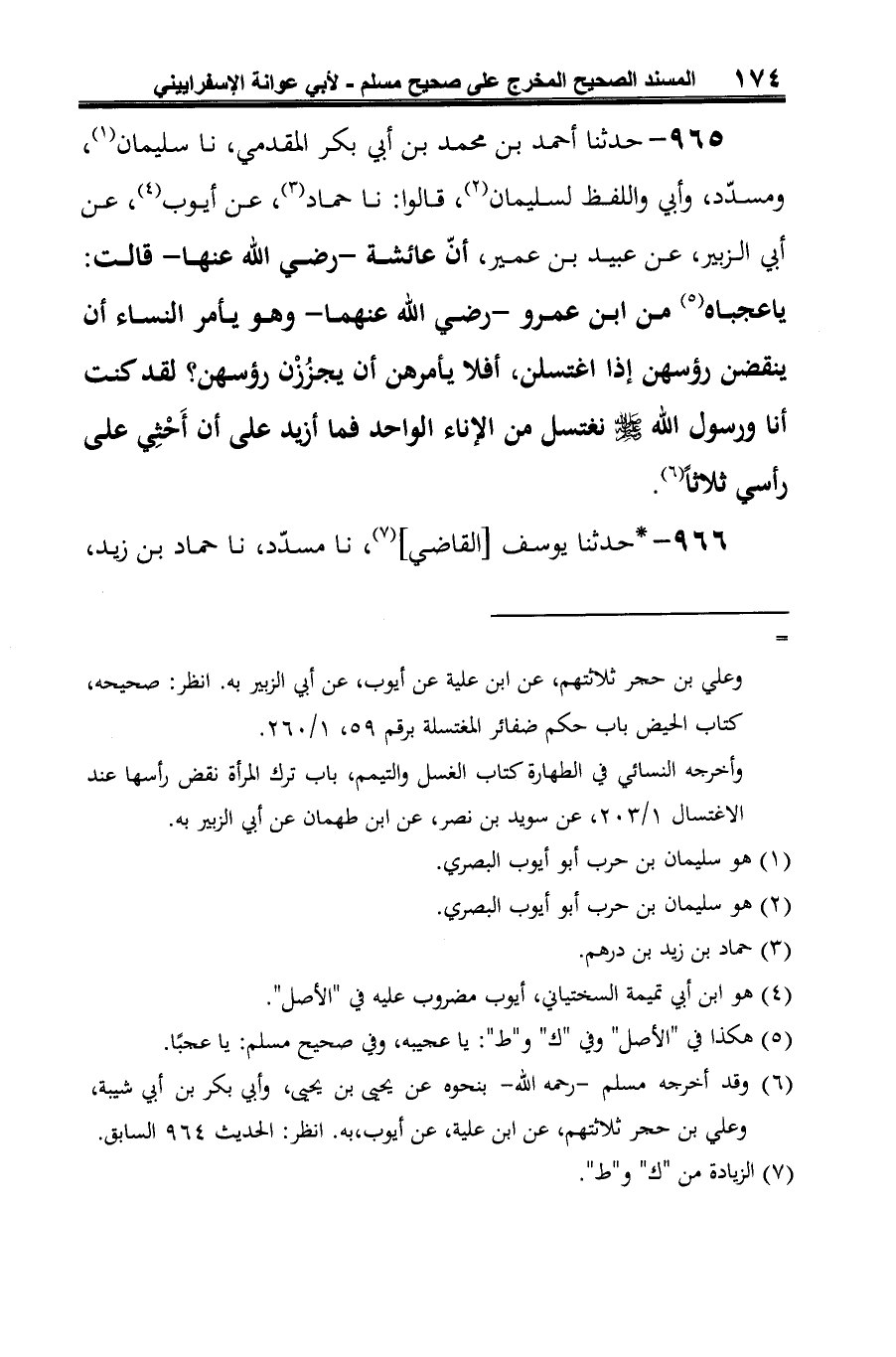 965 - حدثنا أحمد بن محمد بن أبي بكر المقدمي، نا سليمان (¬1)، ومسدّد، وأبي واللفظ لسليمان (¬2)، قالوا: نا حماد (¬3)، عن أيوب (¬4)، عن أبي الزبير، عن عبيد بن عمير، أنّ عائشة -رضي الله عنها- قالت: يا عجباه (¬5) من ابن عمرو -رضي الله عنهما- وهو يأمر النساء أن ينقضن رؤسهن إذا اغتسلن، أفلا يأمرهن أن يجزُزْن رؤسهن؟ لقد كنت أنا ورسول الله -صلى الله عليه وسلم- نغتسل من الإناء الواحد فما أزيد على أن أَحْثِي على رأسي ثلاثًا (¬6).