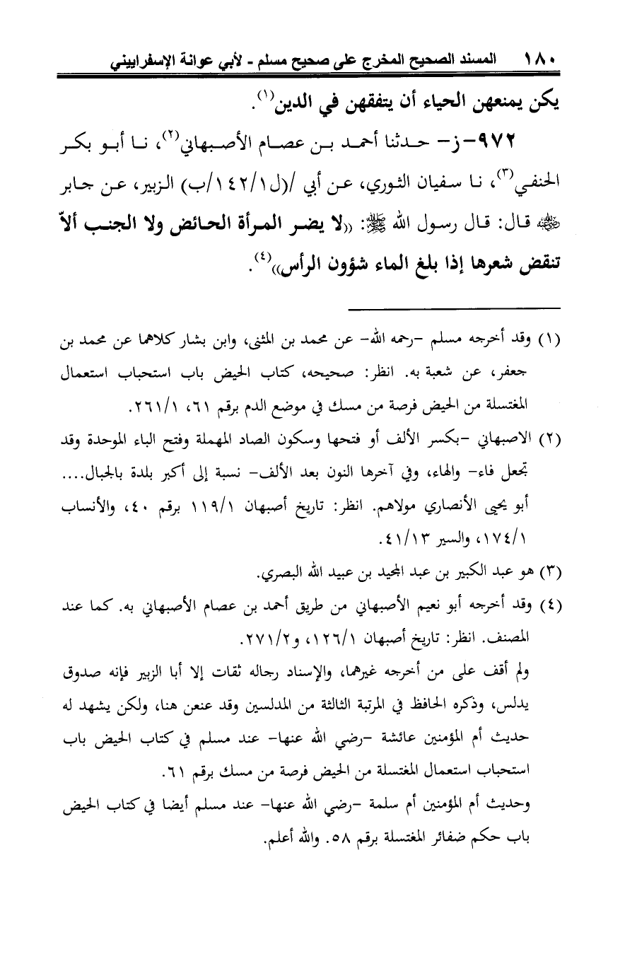 972 - ز- حدثنا أحمد بن عصام الأصبهاني (¬1)، نا أبو بكر الحنفي (¬2)، نا سفيان الثوري، عن أبي الزبير، عن جابر -رضي الله عنه- قال: قال رسول الله -صلى الله عليه وسلم-: "لا يضر المرأة الحائض ولا الجنب ألّا تنقض شعرها إذا بلغ الماء شؤون الرأس" (¬3).
