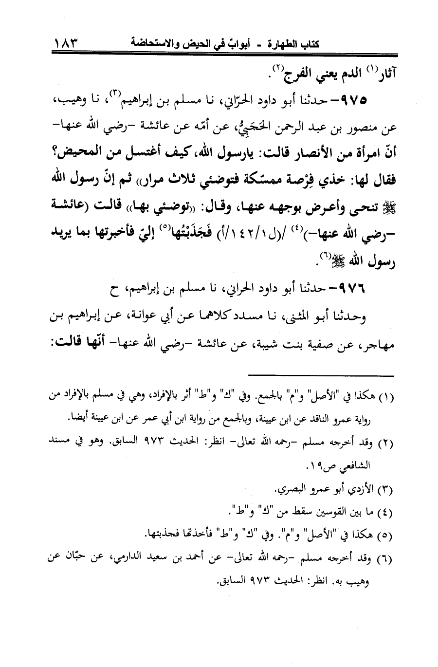 975 - حدثنا أبو داود الحرّاني، نا مسلم بن إبراهيم (¬1)، نا وهيب، عن منصور بن عبد الرحمن الحَجَبِيّ، عن أمّه عن عائشة -رضي الله عنها- أنّ امرأة من الأنصار قالت: يا رسول الله، كيف أغتسل من المحيض؟ فقال لها: خذي فِرْصة ممسّكة فتوضئي ثلاث مرار" ثم إنّ رسول الله -صلى الله عليه وسلم- تنحى وأعرض بوجهه عنها، وقال: "توضئي بها" قالت (عائشة -رضي الله عنها-) (¬2) فَجَذَبْتُها (¬3) إليّ فأخبرتها بما يريد رسول الله -صلى الله عليه وسلم- (¬4).