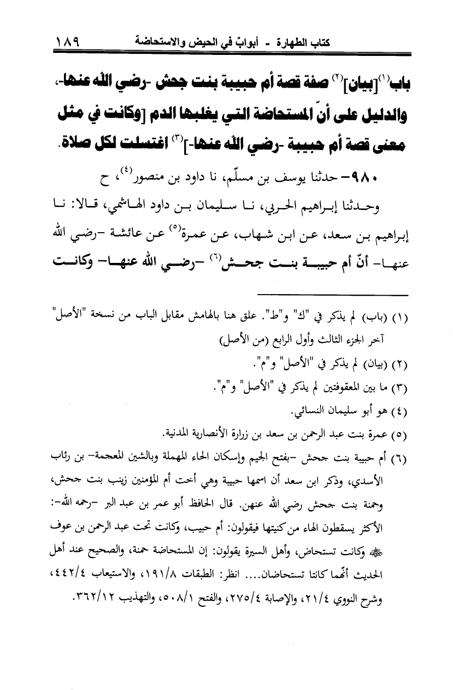 وحدثنا إبراهيم الحربي، نا سليمان بن داود الهاشمي، قالا: نا إبراهيم بن سعد، عن ابن شهاب، عن عمرة (¬2) عن عائشة -رضي الله عنها- أنّ أم حبيبة بنت جحش (¬3) -رضي الله عنها- وكانت