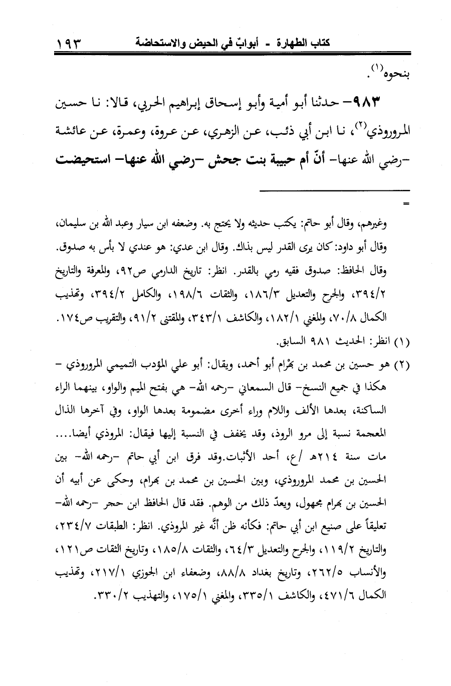 983 - حدثنا أبو أمية وأبو إسحاق إبراهيم الحربي، قالا: نا حسين المروروذي (¬1)، نا ابن أبي ذئب، عن الزهري، عن عروة، وعمرة، عن عائشة -رضي الله عنها- أنّ أم حبيبة بنت جحش -رضي الله عنها- استحيضت