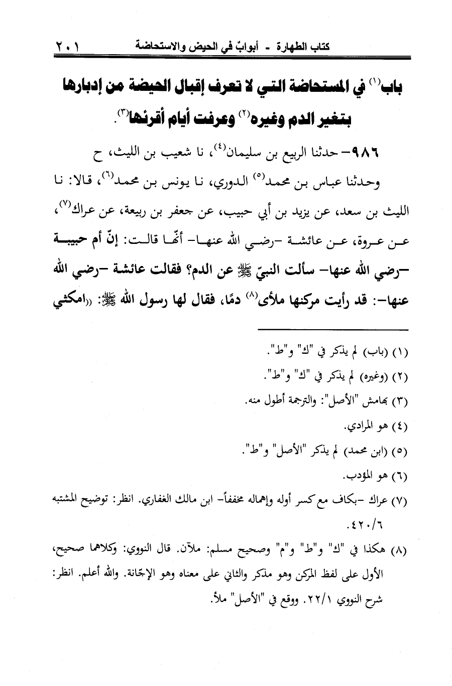 وحدثنا عباس بن محمد (¬2) الدوري، نا يونس بن محمد (¬3)، قالا: نا الليث بن سعد، عن يزيد بن أبي حبيب، عن جعفر بن ربيعة، عن عراك (¬4)، عن عروة، عن عائشة -رضي الله عنها- أنّها قالت: إنّ أم حبيبة -رضي الله عنها- سألت النبيّ -صلى الله عليه وسلم- عن الدم؟ فقالت عائشة -رضي الله عنها-: قد رأيت مركنها ملأى (¬5) دمًا، فقال لها رسول الله -صلى الله عليه وسلم-: "امكثي
