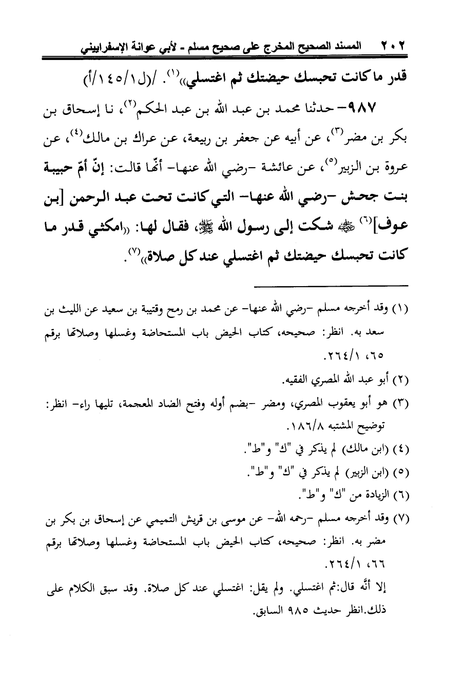 987 - حدثنا محمد بن عبد الله بن عبد الحكم (¬1)، نا إسحاق بن بكر بن مضر (¬2)، عن أبيه عن جعفر بن ربيعة، عن عراك بن مالك (¬3)، عن عروة بن الزبير (¬4)، عن عائشة -رضي الله عنها- أنّها قالت: إنّ أمّ حبيبة بنت جحش -رضي الله عنها- التي كانت تحت عبد الرحمن [بن عوف] (¬5) -رضي الله عنه- شكت إلى رسول الله -صلى الله عليه وسلم-، فقال لها: "امكثي قدر ما كانت تحبسك حيضتك ثم اغتسلي عند كل صلاة" (¬6).