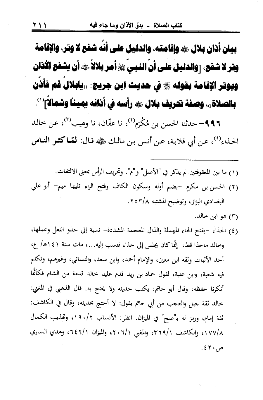 (¬3) الحذاء -بفتح الحاء المهملة والذال المعجمة المشددة- نسبة إلى حذو النعل وعملها، وخالد ما حذا قط، إنّما كان يجلس إلى حذاء فنسب إليه ... ، مات سنة 141 هـ / ع، أحد الأثبات وثقه ابن معين، والإمام أحمد، وابن سعد، والنسائي، وغيرهم، وتكلم فيه شعبة، وابن علية، لقول حماد بن زيد قدم علينا خالد قدمة من الشام فكأنَّما أنكرنا حفظه، وقال أبو حاتم: يكتب حديثه ولا يحتج به. قال الذهبي في المغني: خالد ثقة جبل والعجب من أبي حاتم يقول: لا أحتج بحديثه، وقال في الكاشف: ثقة إمام، ورمز له بـ "صح" في الميزان. انظر: الأنساب 2/ 190، وتهذيب الكمال 8/ 177، والكاشف 1/ 369، والمغني 1/ 206، والميزان 1/ 642، وهدي الساري ص 420.