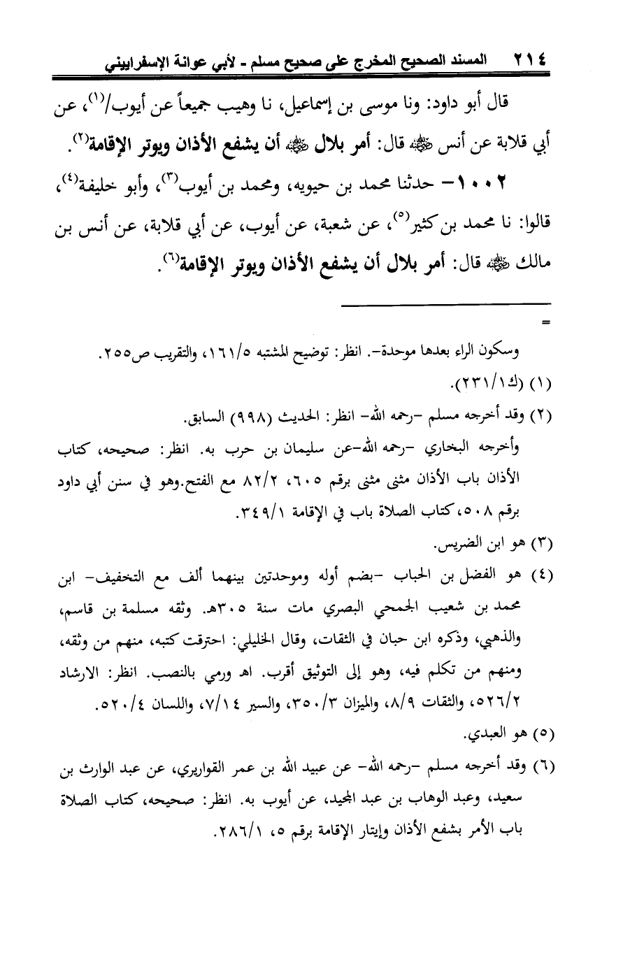 1002 - حدثنا محمد بن حيويه، ومحمد بن أيوب (¬1)، وأبو خليفة (¬2)، قالوا: نا محمد بن كثير (¬3)، عن شعبة، عن أيوب، عن أبي قلابة، عن أنس بن مالك -رضي الله عنه- قال: أمر بلال أن يشفع الأذان ويوتر الإقامة (¬4).