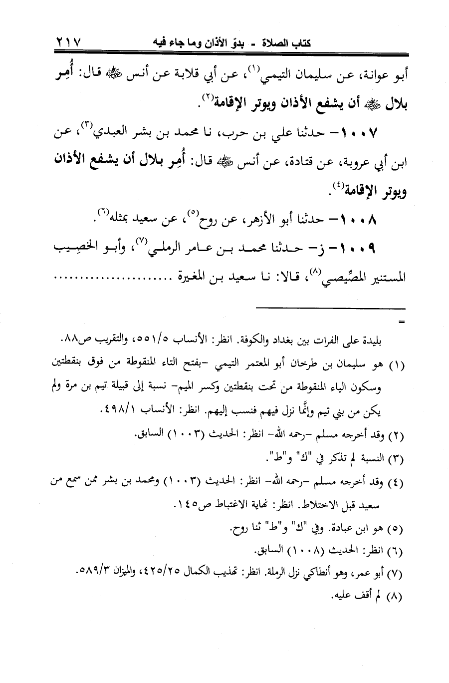 1007 - حدثنا علي بن حرب، نا محمد بن بشر العبدي (¬1)، عن ابن أبي عروبة، عن قتادة، عن أنس -رضي الله عنه- قال: أُمِر بلال أن يشفع الأذان ويوتر الإقامة (¬2).