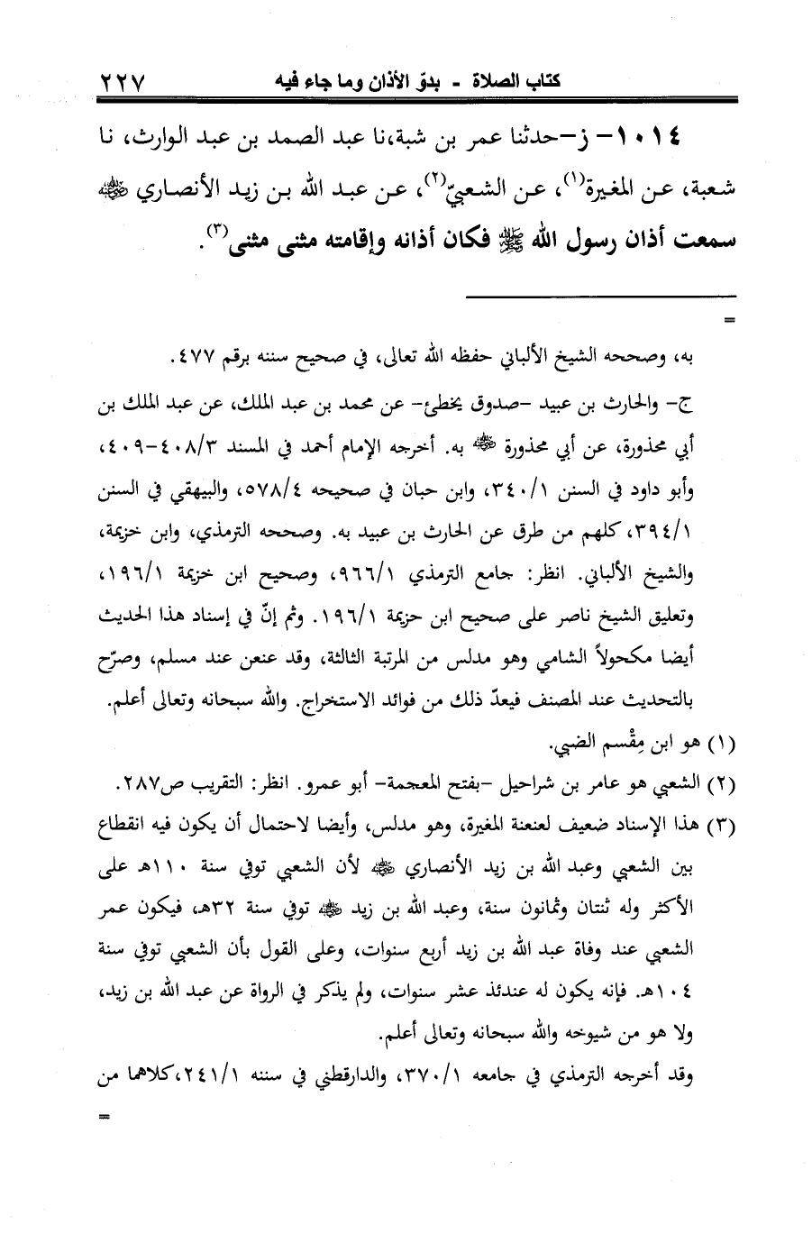 1014 - ز- حدثنا عمر بن شبة، نا عبد الصمد بن عبد الوارث، نا شعبة، عن المغيرة (¬1)، عن الشعبيّ (¬2)، عن عبد الله بن زيد الأنصاري -رضي الله عنه- سمعت أذان رسول الله -صلى الله عليه وسلم- فكان أذانه وإقامته مثنى مثنى (¬3).