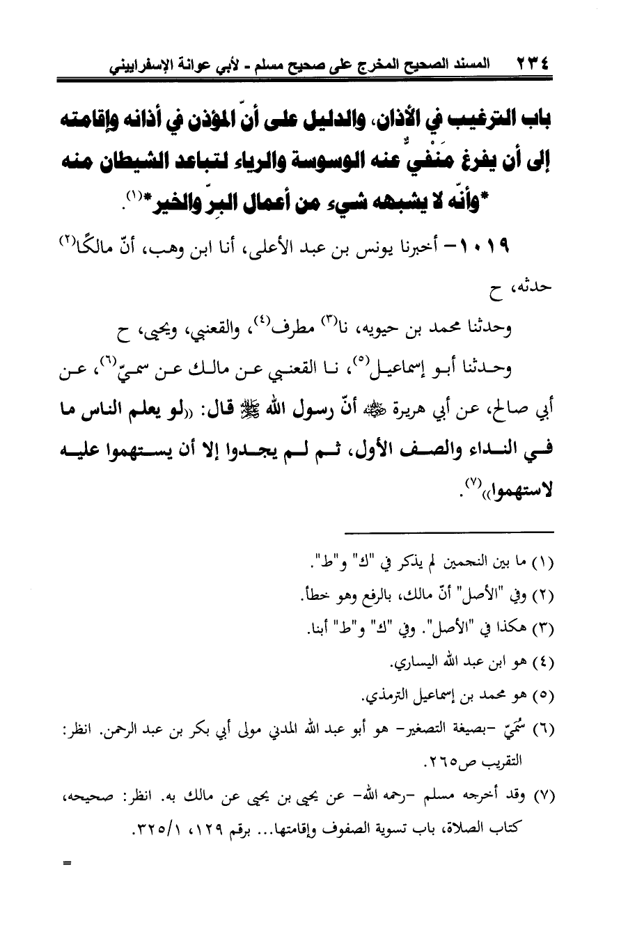 -[235]- = وأخرجه البخاري -رحمه الله- عن عبد الله بن يوسف عن مالك به. انظر: صحيحه، كتاب الأذان، باب الاستهام في الأذان برقم 615، 2/ 96 مع الفتح.