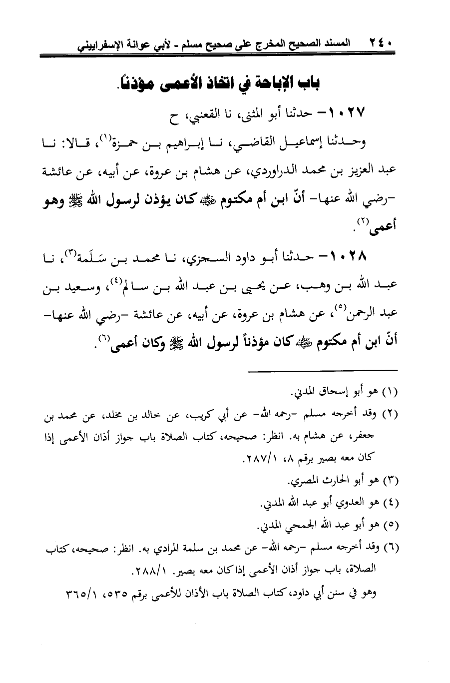 وحدثنا إسماعيل القاضي، نا إبراهيم بن حمزة (¬1)، قالا: نا عبد العزيز بن محمد الدراوردي، عن هشام بن عروة، عن أبيه، عن عائشة -رضي الله عنها- أنّ ابن أم مكتوم رضي الله عنه كان يؤذن لرسول الله صلى الله عليه وسلم وهو أعمى (¬2).